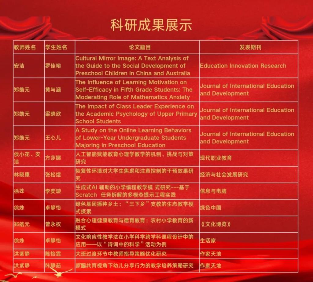 在教育改革不断深化的当下,太阳成tyc9728集团秉持“科研育人、教学相长”的办学理念,积极探索本科阶段“师生共研、以研促学”的高质量育人路径。近期,太阳成tyc9728集团师生在学前教育和小学教育领域成果丰硕,联合完成的十余篇科研论文相继发表于国内外专业期刊,彰显出浓厚的科研氛围与卓越的人才培养成效。 太阳成tyc9728集团着力构建“教师主导、学生参与”的科研育人机制,鼓励本科生在导师引领下深度参与学术选题、论文撰写及研究项...