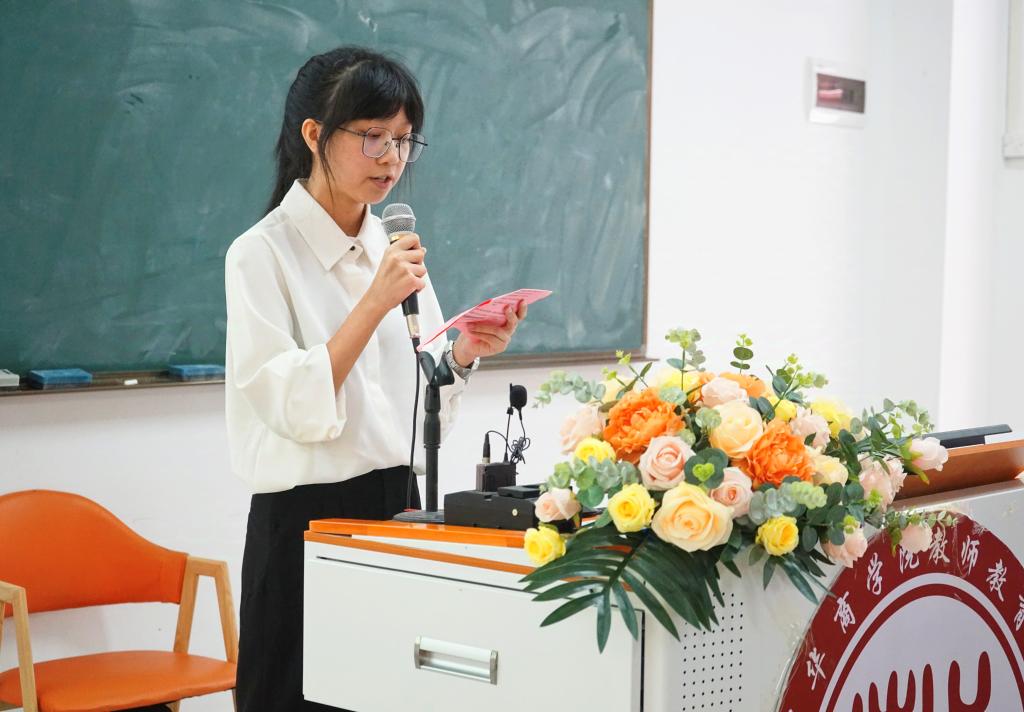 新生代表何璇同学则宛如一颗闪耀的新星,满怀着对未来的无限憧憬以及对教师职业的神圣使命感。她倡议新生们胸怀壮志,目标明确,为成为优秀的人民教师而努力拼搏。