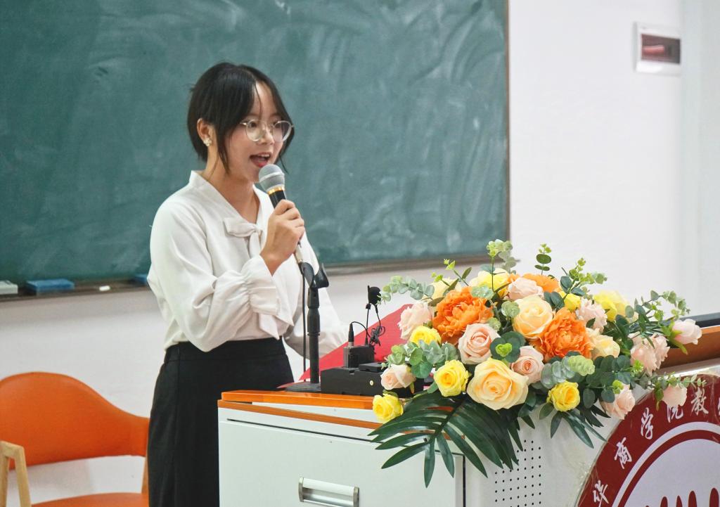 老生代表吴汝丽同学如一位引路人,分享了自己在太阳成tyc9728集团的学习心得和动人的成长故事。她的话语如同温暖的阳光,洒落在每一位学弟学妹的心田,激励着他们珍惜时光,努力学习,为祖国的教育事业贡献自己的力量。