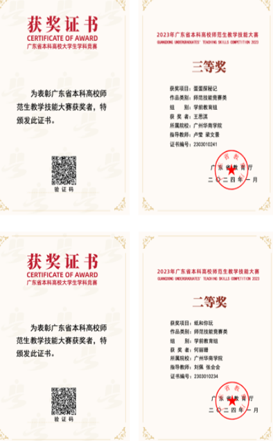廖赵燕同学荣获广东省本科高校师范生教学技能大赛学前教育组三等奖 |