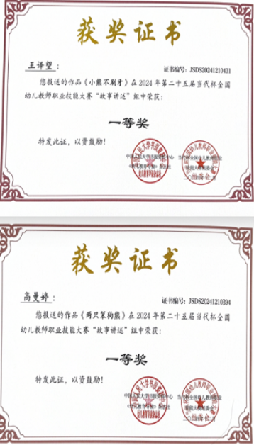 王思淇和林佳纯同学荣获全国高校学前教育师范生教学技能测试大赛一等奖 |