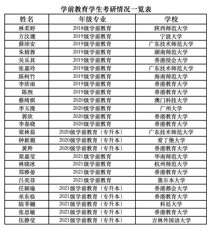 学生具有较强的研究能力与创新意识。近两年共有25名学前教育专业学生考取国(境 )内外知名学校的硕士研究生。学生在全国高校学前(幼儿)教育专业优秀毕业论文评选中荣获佳绩,获得一等奖3人,二等奖7人,三等奖9人。