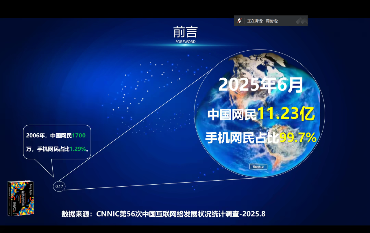 随着人工智能技术的飞速迭代,“人机共生” 已从科幻构想逐步走进现实,深刻影响着人类社会的文化形态与教育模式。在此背景下,本次沙龙聚焦后人类文化这一新兴领域,旨在通过分享与思想碰撞,帮助学前教育领域师生厘清技术变革对教育的冲击与机遇,为后续教学实践与人才培养提供理论参考。主讲人周剑铭老师长期深耕教育技术与文化研究领域,对人机共生理论及数字时代教育变革有着深入洞察。他以 “技术如何重塑人类与教育” 为切入点,开启了本次讲座的核心内容分享。周剑铭老师首先通过两组关键数据,直观展现了数字化浪潮的迅猛发展:2006 年,中国网民数量约为 1700 万,其中手机网民占比仅 1%;而截至 2025 年 6 月,中国网民规模已攀升至 11.23 亿,手机网民占比高达 90%。这一数据差异清晰揭示了 “全民数字化” 时代的到来,也印证了尼葛洛庞帝在《数字化生存》一书中的预言 —— 如今,数字化身份、数字化信息与数字化关系已成为人类生活的重要组成部分。