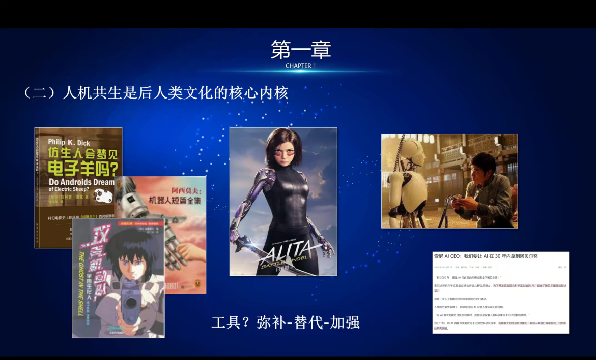 在理论层面,周剑铭老师系统梳理了 “共生理论” 与 “后人类理论” 的核心内涵。他指出,共生理论最初源于生物学领域,如今已扩展到社会层面,涵盖人与自然、人与机器等多元共生关系;而后人类理论则打破了 “人类中心主义” 的传统视角,强调跨物种协作的可能性,例如漫威宇宙中 “星际文明共生” 的设定,正是后人类文化 “多元协同” 理念的艺术表达。谈及 “人机共生” 的起源,周剑铭老师介绍,这一概念由计算机科学家利克莱德提出,其核心并非 “技术替代人类”,而是 “人与计算机深度协作、共同学习”—— 人类凭借创造力与情感理解能力把握方向,计算机依托算力与数据处理能力高效执行,二者形成 “1+1>2” 的协同效应。在分析技术对教育的具体影响时,周剑铭老师提出,数字时代的文化环境已发生显著变化:儿童不再主要通过文字接触世界,而是通过图像、短视频等数字化载体认知成人社会,这导致传统 “真善美” 导向的文化品性,逐渐向 “数据驱动、效率优先” 的方向转变。