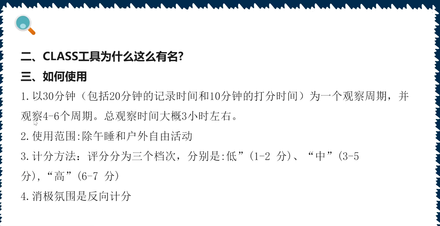 为帮助教师更好地掌握工具使用方法,校伟老师通过多个真实教学案例,演示如何运用CLASS评估量表对师幼互动质量进行精准评估。从课堂场景中的互动细节捕捉,到评估指标的对应匹配,她逐一讲解实操步骤,为教师提供了可直接借鉴的实践范本。同时,校伟老师还重点强调了评估过程中的关键注意事项,包括观察时间的合理分配、评分方法的规范使用等核心要点。