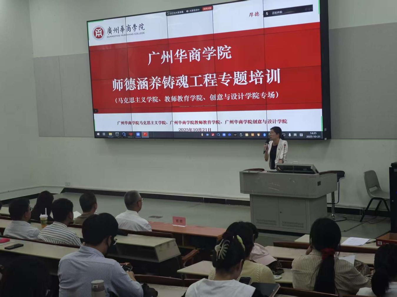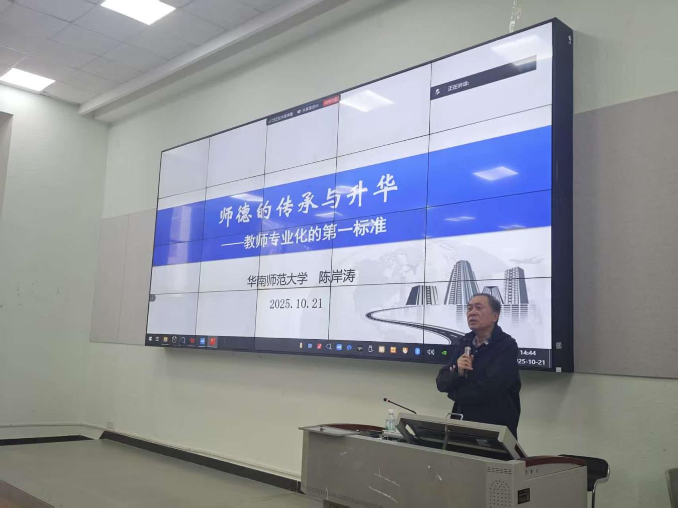 2025年10月21日下午,太阳成tyc9728集团组织全体专任教师参与师德涵养铸魂工程专题培训。本次培训特邀华南师范大学教授陈岸涛主讲,以“师德的传承与升华——教师专业化的第一标准”为主题,为全体教师带来了一场兼具理论深度与实践指导意义的专题培训。