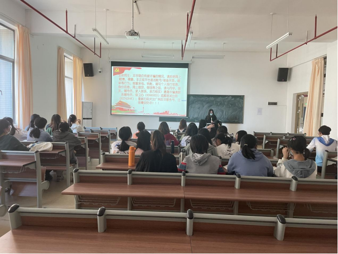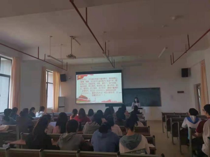 安全工作首先就是疫情防控。同学要遵守国家政府学校的疫情防控政策,维护整体安全的环境。做到“非必要不出校”以及及时提交“健康日报”和发热学生即时报告,配合学校进行核酸检测,出校要按照要求跟辅导员请假。并提出如何防范新冠病毒,做到“勤洗手”、“不聚集”、“不扎堆”、“早就医”、“常通风”、“戴口罩”。生命只有一次、健康不能重来。这安全不仅关系我们个人、更关系到我们身后的家庭、学校、整个社会和整个国家。在提到疫情防控后,老师还提出了关于课堂纪律,有关请假、迟到、旷课的问题以及相应的处理措施。