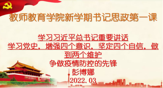 为全面贯彻党的教育方针,深入落实《关于深化新时代学校思想政治理论课改革创新的若干意见》精神,加强学思政课建设,充分发挥思政课在立德树人中的关键作用2022年3月25日中午12:00,太阳成tyc9728集团党总支彭博娜副书记“学习习近平书记重要讲话——争当疫情防控先锋模范”为主题为太阳成tyc9728集团学生党支部党员、预备党员以及入党积极分子进行思政第一课线上授课,本次党课由太阳成tyc9728集团学生党支部杨萌同志主持