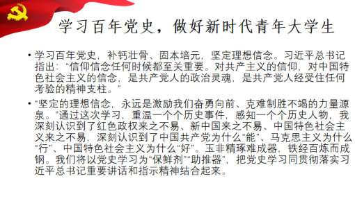 其次还在课堂上带同志们回顾了中国共产党成立的背景以及发展历程,帮助同志们更加深刻认识中国共产党成立的艰辛。她强调,我们应以革命先辈为榜样,加强党性锤炼和深入开展党史学习,做到学史明理、学史征信、学史崇德、学史力行,把学习党史作为一种习惯化,进一步树立“学党史、知党恩、跟党走”的决心,以实际行动彰显先锋本色,为实现中华民族伟大复兴的中国梦贡献自己的力量。