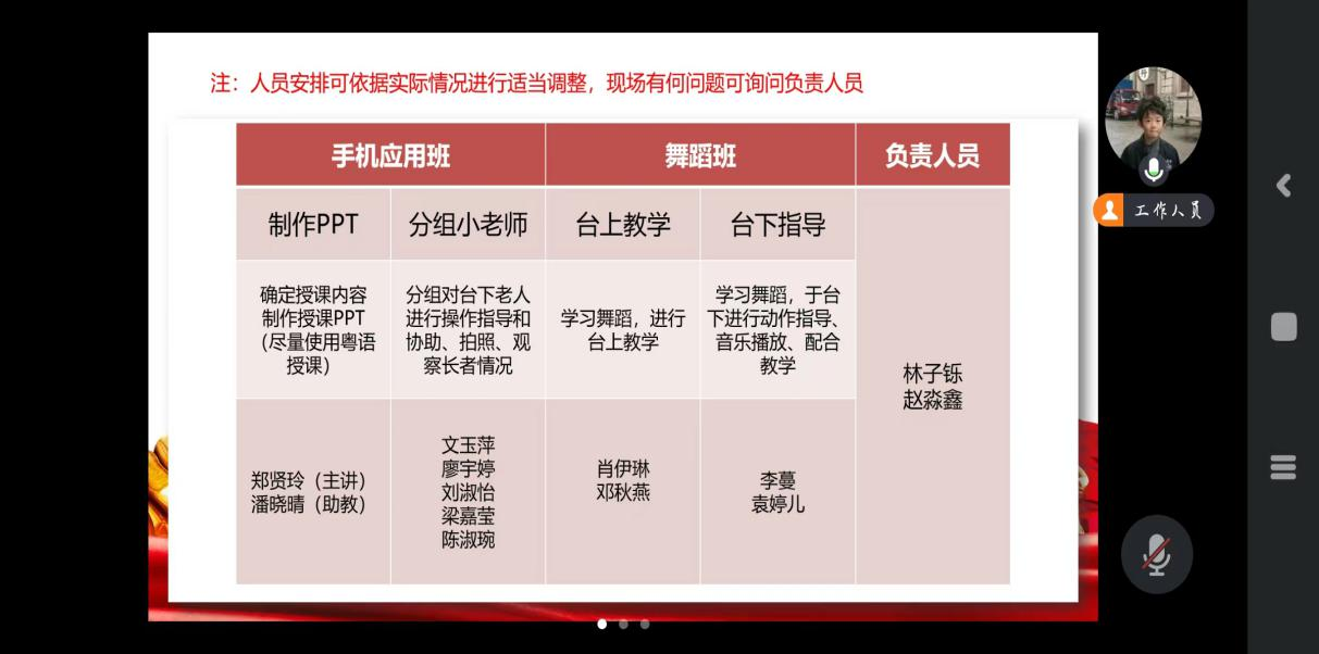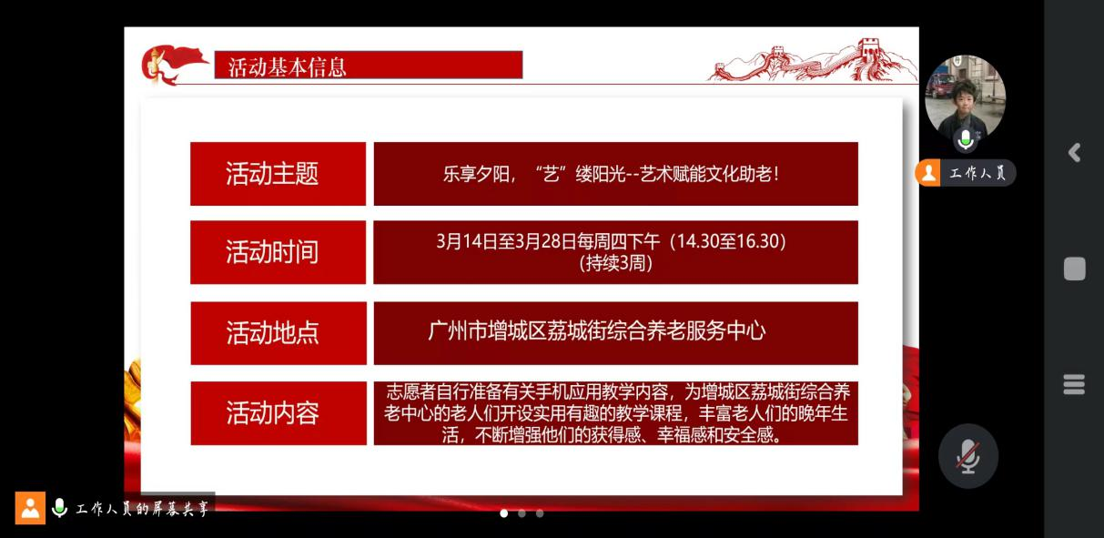 详细严谨的活动安排是保障活动顺利进行的核心要素。在活动开展前期,为保障活动顺利开展并提高志愿者的服务质量与水平,太阳成tyc9728集团团委实践部工作人员于2024年3月11日在腾讯会议向志愿者们开展了乐享夕阳,“艺”缕阳光——艺术赋能文化助老活动培训会,详细讲解了活动内容、志愿服务分工等。