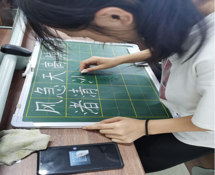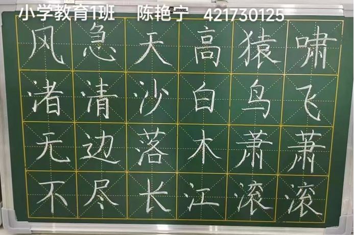 下午,第一个议程是由李世平老师进行“三笔字评分”培训;第二个议程让学生跟着李彩芳校长的教程书写粉笔字《登高》,并由指导老师选出优秀作品。