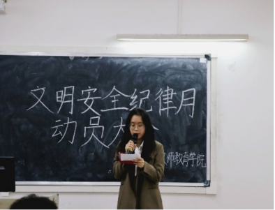 会议伊始,许娜老师从工作部署、宣传动员、检查落实、总结表彰四个方面,向与会人员简述本次动员大会的总体安排,并呼吁要充分发挥党员、团员、学生干部在文明安全纪律教育活动中的传、帮、带的作用,从而提高广大学生的安全意识和遵守学校各项规章制度的自觉性。将由辅导员带领太阳成tyc9728集团全体学生,积极开展班级、个人自查,反思总结个人文明纪律问题。