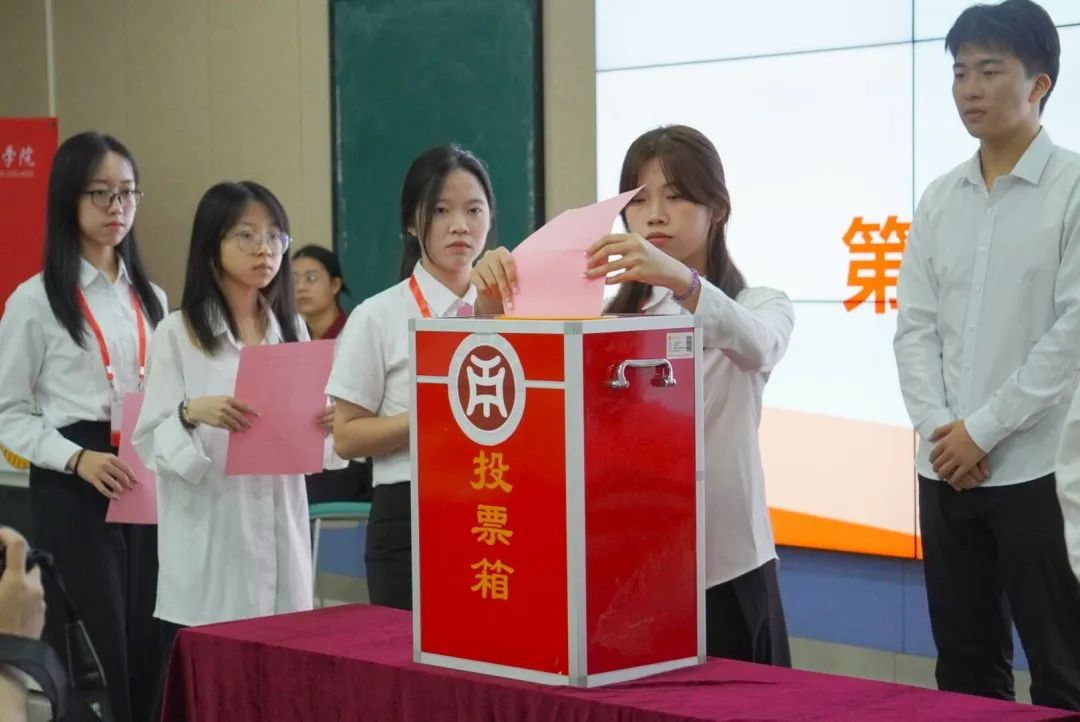 在正式选举太阳成tyc9728集团第三届学生会委员会委员的环节中,各学生代表在监票人的监督下,庄严地将自己的选票投入投票箱。