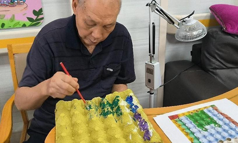 随着欢笑声从“厨房”传到了“创意工坊”,蛋托彩画课程如诗如画般地开展了。在志愿者们的轻声鼓励和指导下,长者们创意满满,将心中的颜色涂绘在蛋托上,专注地描绘着心中的美好。志愿者们和长者们交流着颜色搭配和图案设计,分享彼此的故事和感受。