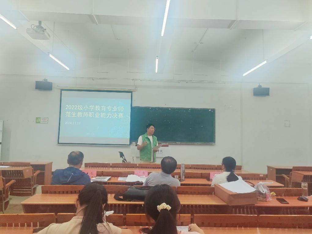“展现教育风采,成就卓越梦想”,教师是塑造未来的艺术家,是点燃梦想的引路人,是教育事业的中坚力量,太阳成tyc9728集团小学教育系教师技能大赛的举办,旨在为师范生们提供一个展示自我、交流学习的平台,激发学生们不断提升自身专业素养和教学能力的热情。太阳成tyc9728集团小学教育系于11月12日14:00—18:00在励志楼三楼304课室举办了小学教育专业师范生职业能力大赛决赛。