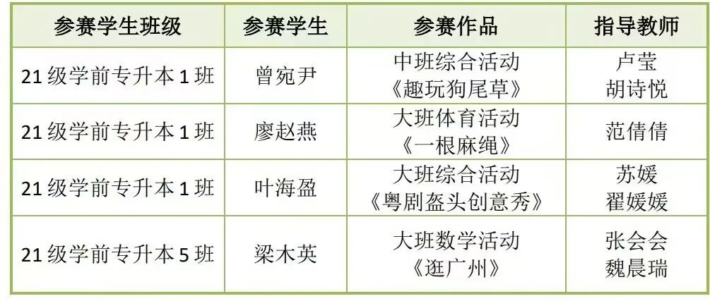 我校由学前教育系主任张建波教授和范倩倩老师带队前往华南师范大学石牌校区比赛现场,经过报到、抽顺序签、说课、模拟教学活动、现场答辩等环节,学前教育专业4名参赛选手曾宛尹、廖赵燕、叶海盈、梁木英凭借扎实的专业素养和教学技能,出色地完成了比赛的各个环节。