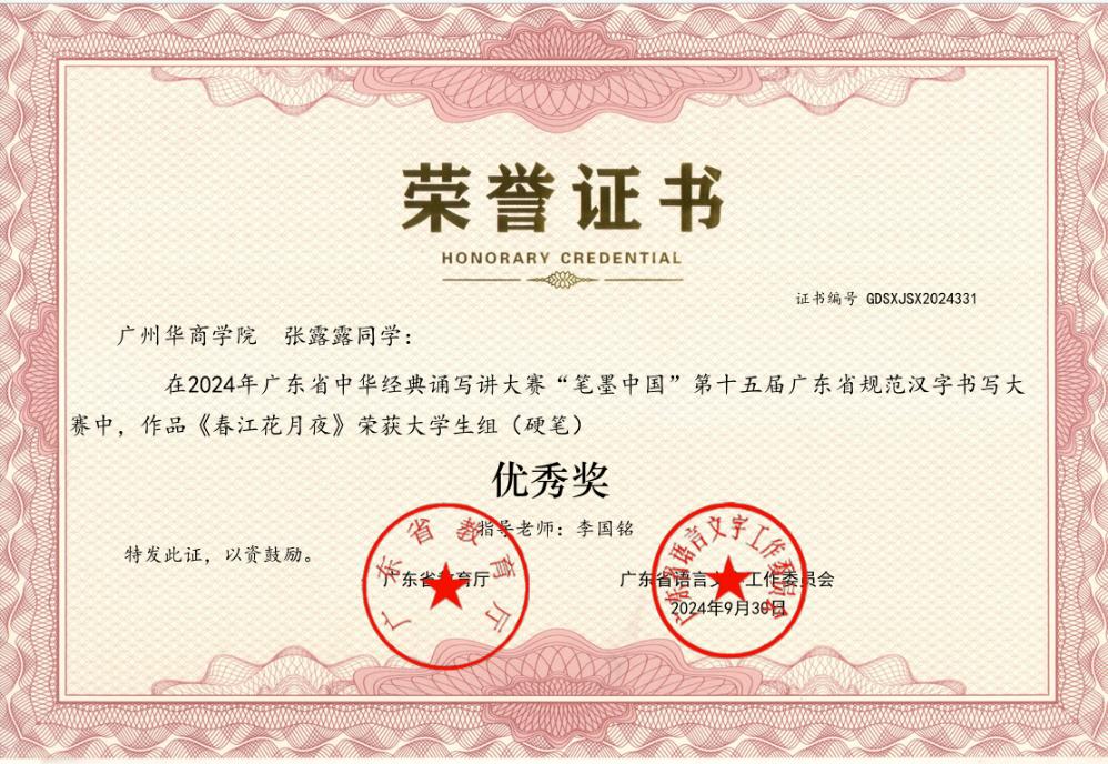 此外,我院李国铭老师荣获第六届中华经典诵写讲大赛“笔墨中国”汉字书写大赛高校教师组优秀奖,荣获第十五届广东省规范汉字书写大赛高校教师组一等奖的优异成绩。