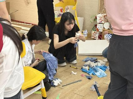 在入园后的见面会上,周园长向同学们八幼“尊重生命,以人为本”的办园理念,之后同学们迅速组队,投入了幼儿园环境创设的工作中。一班的学生制作扎染作品,他们开心地表示:“这样的实践课程非常有意义,既帮助自己深入了解幼儿园环创的过程与意义,又能够学到一项新的技能,丰富自己的生活”。二班则是用彩色纸板和扭扭棒装饰一只漂亮的立体“孔雀”。环创体验结束后,学生们手持《学前儿童科学教育》中的观察量表开始了课程观察,观摩真实的幼儿园科学活动的开展情况。
