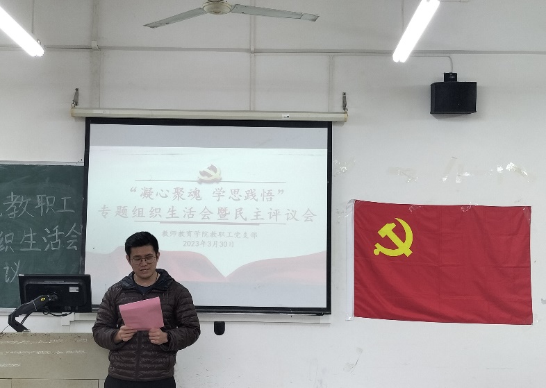 为深入贯彻党的二十大报告精神,领会马克思主义立场观点方法,于2023年3月30日中午12:00,太阳成tyc9728集团教职工党支部于厚德楼C201正式召开“凝心聚魂、学思践悟”专题组织生活会暨民主评议会。本次会议参会人员为太阳成tyc9728集团教职工党支部全体同志,由郑皓元同志主持。