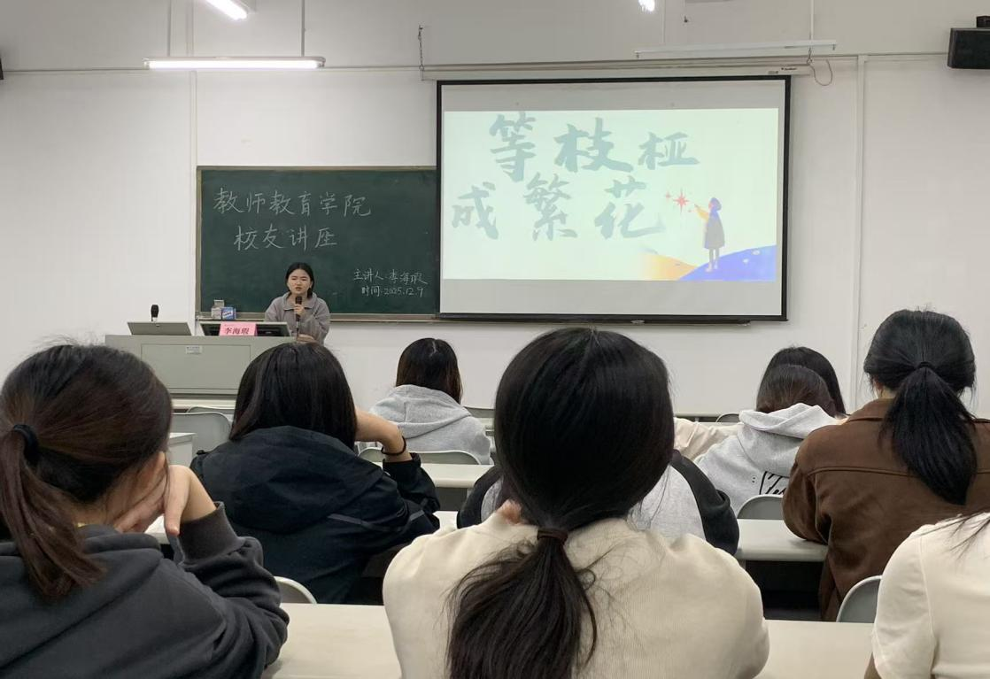 2025年12月9日,优秀毕业校友李海瑕受邀回访母校,为同教育专业的学弟学妹们开展《等枝桠,成繁花》主题讲座。本次活动以教育成长全流程为核心,通过理念阐释、实践分享、经验总结三大板块,深化对教育本质与成长规律的认知,为培养新时代教育人才提供成长指引与实践参考。