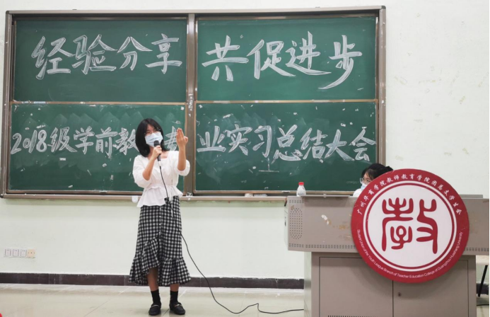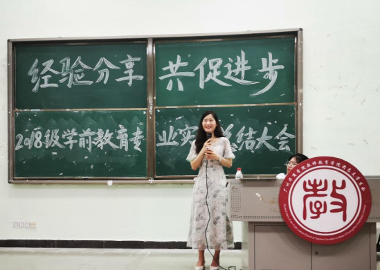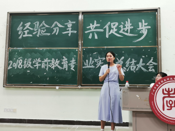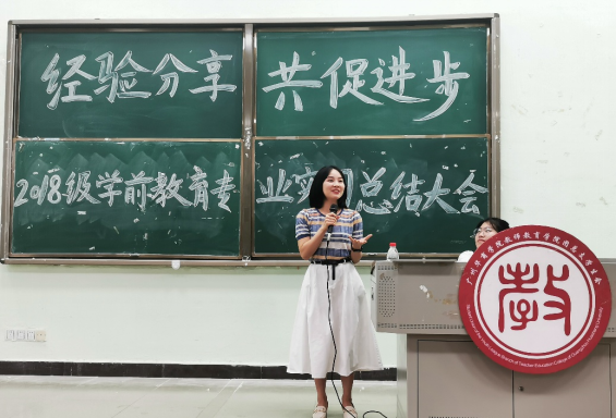 第一位优秀实习生代表是18级学前教育1班的刘昭琳同学,她向大家分享了自己实习的经验与感受。刘昭琳同学经验分享有三点:第一,根据儿童水平、认识能力与环境的适应性,灵活变通课程的目标;第二,抓住孩子的特点与喜欢,注重课程的灵活性与创新性,更好地与孩子进行有效沟通;第三,利用写周记来记录实习的收获与心得,通过周记进行反思。