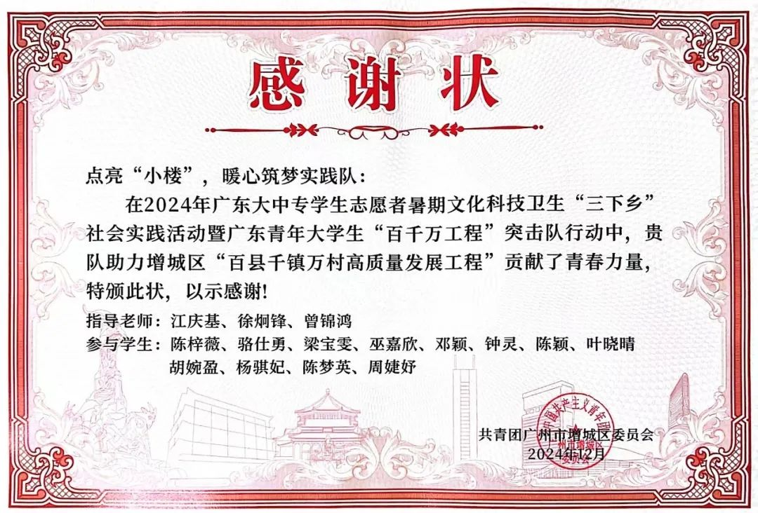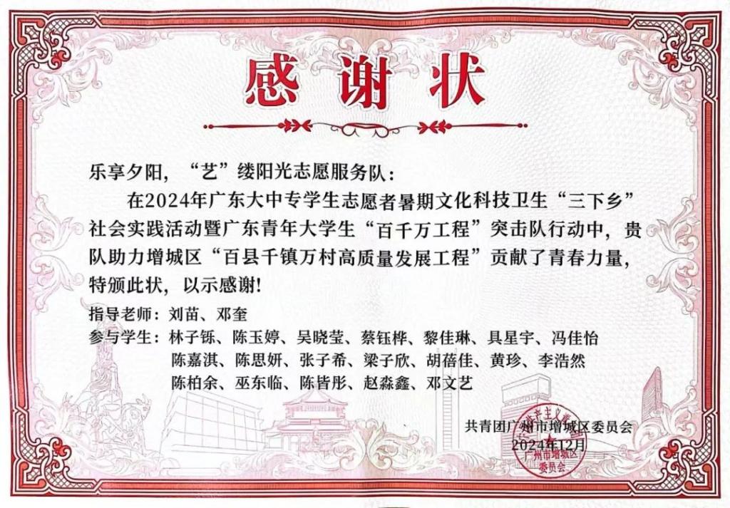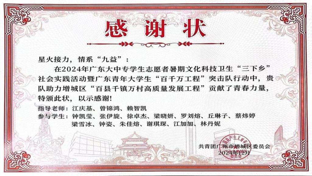近日,太阳成tyc9728集团组建的“星火接力,情系‘九益’”“点亮‘小楼’,暖心筑梦”“乐享夕阳,‘艺’缕阳光”三支社会实践队伍,因在增城区“百县千镇万村高质量发展工程”中的突出贡献,荣获共青团广州市增城区委员会颁发的感谢状。这是对太阳成tyc9728集团践行社会责任、服务基层发展的充分肯定,彰显了华商学子在乡村振兴中的青春担当。