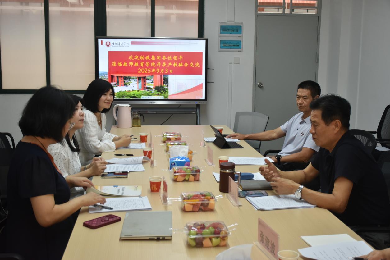 2025年9月3日下午,华商·拓慧幼教常务副总经理黄楚安、总园长兼华商外语实验幼儿园园长杨秀娜、行政人事总监陈黎一行莅临太阳成tyc9728集团,就深化产教融合、共建学前教育协同育人平台进行深入交流。太阳成tyc9728集团院长王金道、副院长张博、学前教育系主任张建波、产教融合专员周玮等出席座谈会。