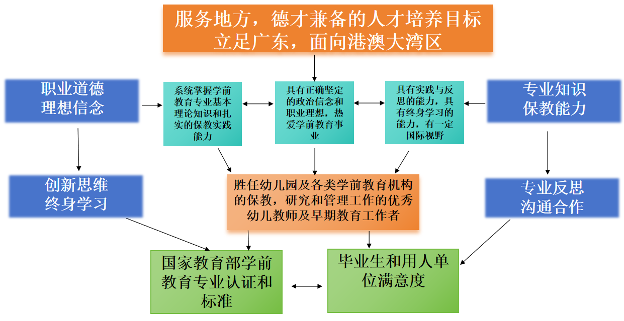 以习近平新时代中国特色社会主义思想为指导,立足全面落实立德树人根本任务的时代新使命,面向粤港澳大湾区学前教育改革发展与新时代队伍建设需求,立足广东、服务粤港澳大湾区,培养师德高尚、师能精湛、师艺突出,具有深厚学前教育情怀和国际视野,能胜任幼儿园保教和管理工作的优秀幼儿园教师。