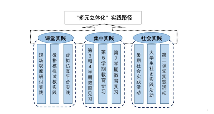 在国家提倡创新创业教育的新形势下,实践能力提升是创新创业教育核心,对提高大学生的创新创业意识与能力,有着重要的作用,为帮助学生将理论知识与教育实践有机结合,明确师范生培养的“实践”取向,本专业从课堂实践、基地实践和社会实践三个维度,构建了“多元立体化”实践路径,全方位提升学前教育专业学生自主研学、主动探索、创新意识和实践能力。