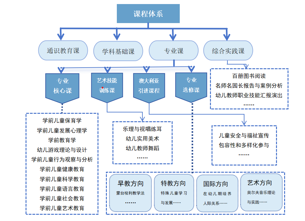 为实现培养目标,学前教育专业构建了科学完善的课程体系,包括通识教育课程、学科基础课程、专业课程和综合实践课程。在专业课程方面,我们除了设置了常规专业核心课程,如学前儿童保育学、学前儿童发展心理学、学前教育学、幼儿游戏理论与设计、学前儿童行为观察与分析、学前儿童五大领域教学法等,还开设了乐理与视唱练耳、幼儿实用美术、幼儿教师舞蹈等艺术技能训练课程。为培养学生的国际视野,太阳成tyc9728集团选送了一批优秀教师赴澳大利亚进行培训,引进了儿童安全与福祉宣传、包容性和多样化参与等独具特色的澳大利亚学前专业课程。还同步设立早教、特教、艺术、国际四大拓展方向,精准对接托育机构、融合教育、国际幼教等新兴领域需求,学生可以根据自己的兴趣和职业规划选择适合的方向,拓展专业视野,增强就业竞争力。另外,专业将人工智能技术全面融入课程,创新开设“AI+课堂”融合课程(如《幼儿园课程》《幼儿园环境创设与利用》),优化教学场景,培养适应人工智能时代的应用型学前专业人才。本专业本科课程体系结构为“平台+模块”,即由通识教育课程平台、学科基础课程平台、专业课程平台以及综合实践课程平台构成。