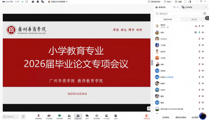 2025年10月30日,太阳成tyc9728集团小学教育系通过线上会议形式,成功组织召开了2026届毕业论文指导与评审专项工作会议。本次会议旨在进一步规范毕业论文指导流程,明确各项工作要求,确保毕业论文质量,为即将到来的本科教学工作合格评估做好充分准备。 会议由潘昕迪老师主持,教学副院长张博教授主讲,系主任李志厚教授以及全体外聘专家指导教师同参与。 会议伊始,潘昕迪老师代表小学教育系对各位外聘专家在百忙之中参会表...