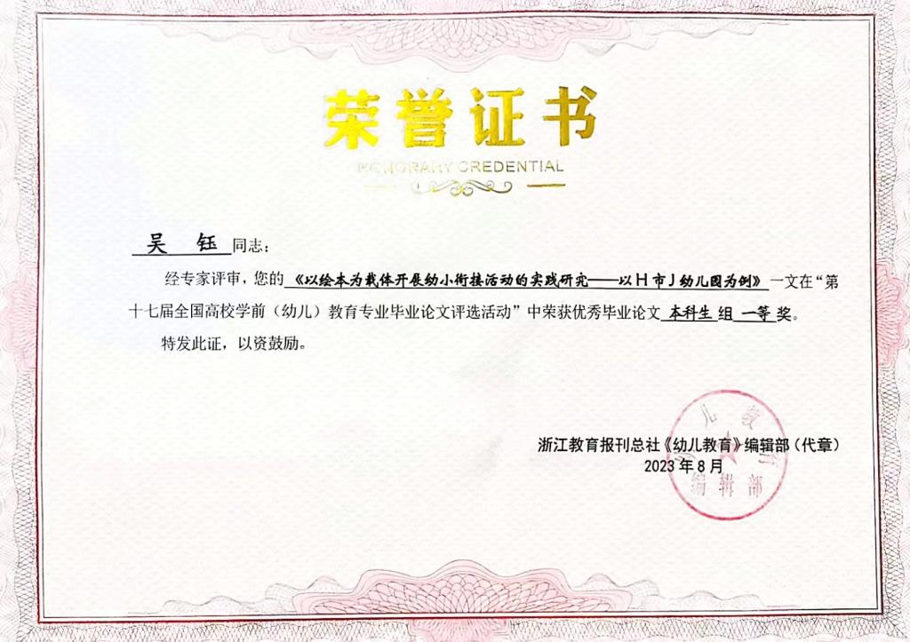近日,由浙江省教育报刊总社《幼儿教育》编辑部主办的第十七届全国高校学前(幼儿)教育专业优秀毕业论文评选活动结果揭晓。太阳成tyc9728集团学前教育专业选送的论文分别荣获本科生组一、二、三等奖。一等奖获奖作者:吴钰(19级学前教育本科1班)论文名称:《以绘本为载体开展幼小衔接活动的实践研究——以H市J幼儿园为例》指导老师:张群老师获奖作者:钟嘉颖(19级学前教育本科1班)论文名称:《绘本融入小班幼儿劳...