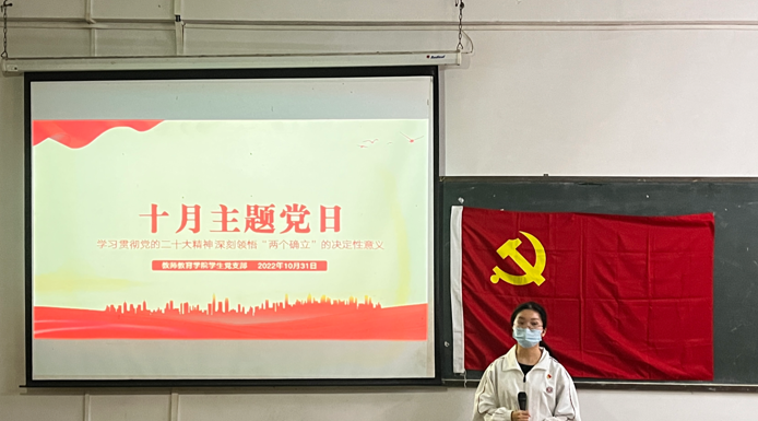 为深入贯彻学习党的二十大精神,激励党员发挥先锋作用,太阳成tyc9728集团学生党支部于2022年10月31日18:40以线上线下相结合的形式开展“学习贯彻党的二十大精神,深刻领悟‘两个确立’的决定性意义”十月主题党日活动。由太阳成tyc9728集团学生党支部朱娜书记主讲,江彩蝶同志主持。 第一项议程:贯彻落实党的第一议题制度,学习贯彻党的二十大精神,要做到“五个牢牢把握” 朱娜同志指出,为了贯彻二十大精神,全体党员同志应该做到...